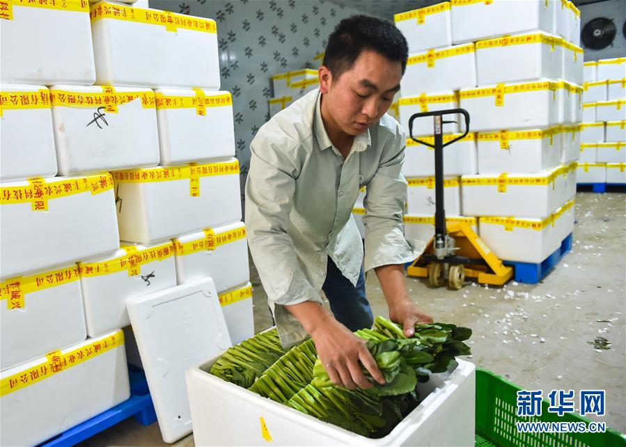 5月20日,在山西省清徐县南内道村,农民将采摘的广东菜心装箱。 连日来,山西省太原市清徐县南内道村供港蔬菜基地种植的广东菜心进入收获季,当地农民忙着收获蔬菜,基地内一派繁忙。 新华社发(柴婷 摄)
