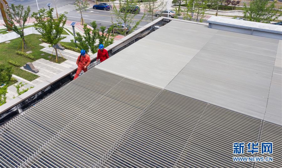 5月21日,工作人员在巡查“城市客厅”屋顶光伏设备并网情况(无人机照片)。新华社记者 徐昱 摄