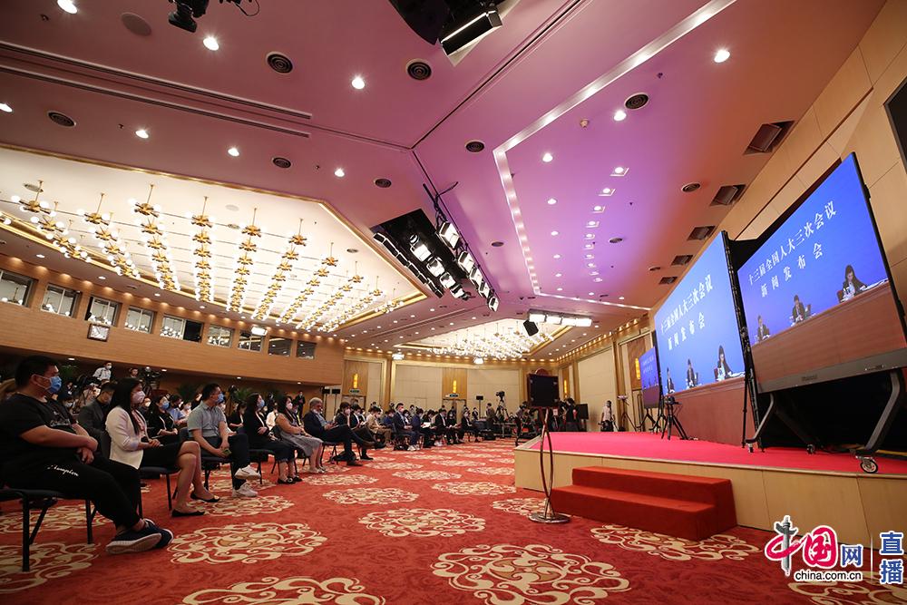 5月21日21时40分,十三届全国人大三次会议在人民大会堂新闻发布厅举行新闻发布会,图为梅地亚分会场。中国网记者 张若梦 摄