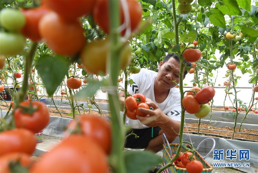 在广西环江毛南族自治县川山镇塘万村大棚果蔬种植基地,村民在采收西红柿(5月12日摄)。新华社记者 陆波岸 摄
