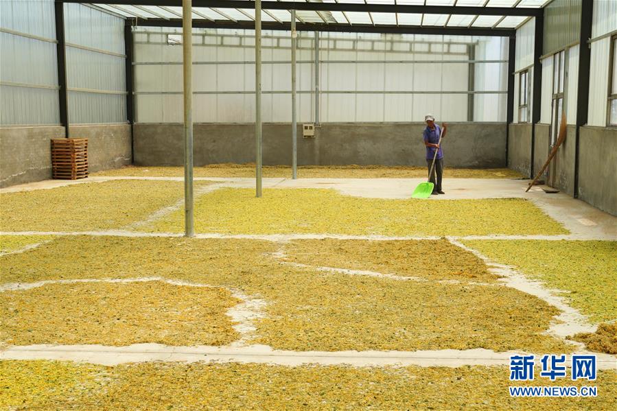 5月21日,河北省清河县农垦金银花种植专业合作社社员在晾晒金银花。 2017年以来,河北省清河县在推进农业产业结构调整过程中,结合市场需求,立足当地土壤、气候特点,依托公司“订单”引导农民发展金银花种植。目前,清河县金银花种植面积近2000亩,带动40多个村庄的2000余名农民人均增收千元以上。 新华社记者 牟宇 摄