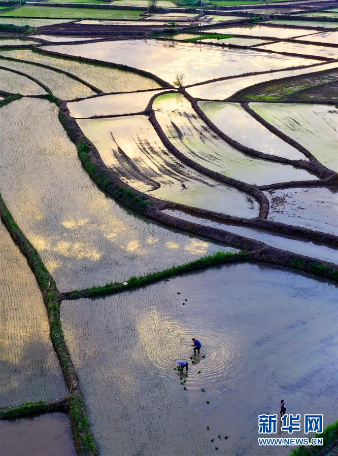 5月21日,安徽省六安市霍邱县长集镇农民在田间插秧(无人机照片)。 初夏时节,农民在田间劳作的身影构成一幅幅优美画卷。 新华社发(陈力 摄)