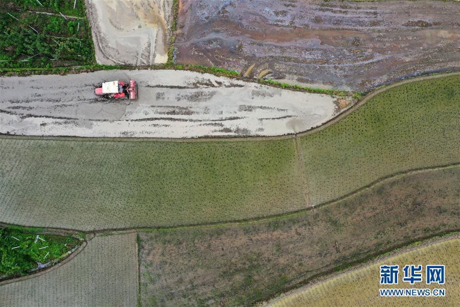 5月22日,农民在湖南省湘西土家族苗族自治州龙山县石羔街道干比社区耕田(无人机照片) 。 初夏时节,农民在田间劳作的身影构成一幅幅优美画卷。 新华社发(曾祥辉 摄)