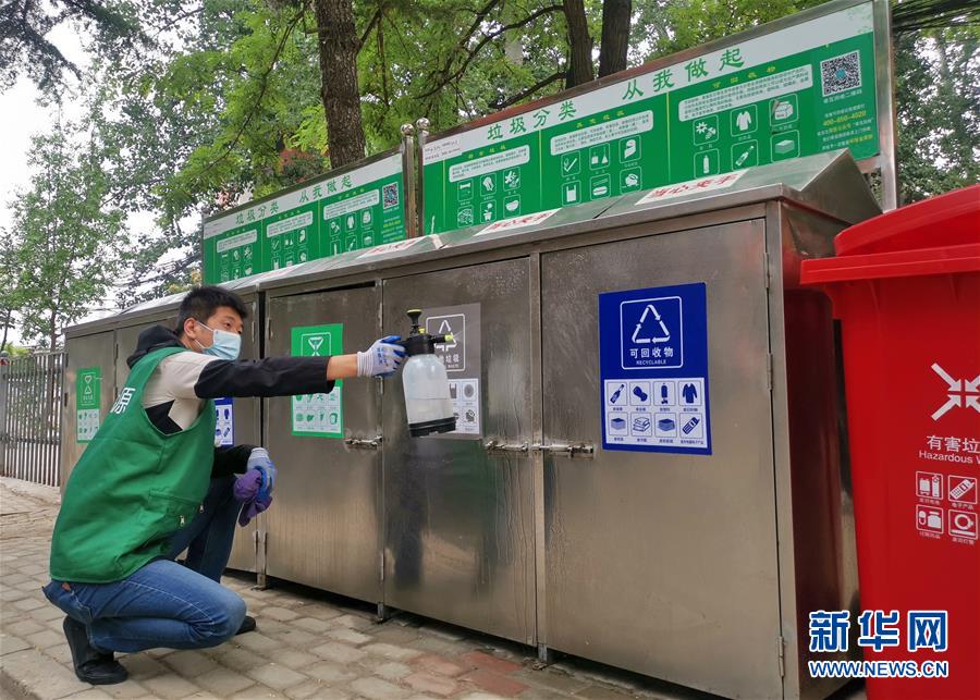 5月22日,丰台区东高地街道的社区工作人员在为分类垃圾桶消毒。 北京市实施垃圾分类以来,丰台区东高地街道在各个社区内全部安置了分类垃圾桶、分类指示牌,建立了分类垃圾运送、消毒防疫、居民分类投放等一系列制度,并为居民发放家用分类垃圾桶,促进和方便居民实施家庭垃圾分类。 新华社记者 李欣 摄