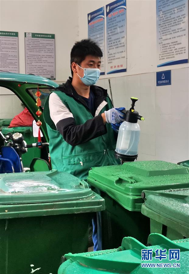 5月22日,丰台区东高地街道的社区工作人员在为分类垃圾桶消毒。 北京市实施垃圾分类以来,丰台区东高地街道在各个社区内全部安置了分类垃圾桶、分类指示牌,建立了分类垃圾运送、消毒防疫、居民分类投放等一系列制度,并为居民发放家用分类垃圾桶,促进和方便居民实施家庭垃圾分类。 新华社记者 李欣 摄
