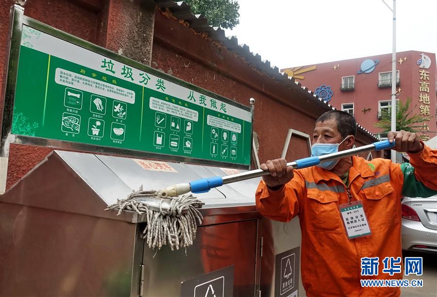 5月22日,丰台区东高地街道的社区工作人员在清洁分类垃圾桶。 北京市实施垃圾分类以来,丰台区东高地街道在各个社区内全部安置了分类垃圾桶、分类指示牌,建立了分类垃圾运送、消毒防疫、居民分类投放等一系列制度,并为居民发放家用分类垃圾桶,促进和方便居民实施家庭垃圾分类。 新华社记者 李欣 摄