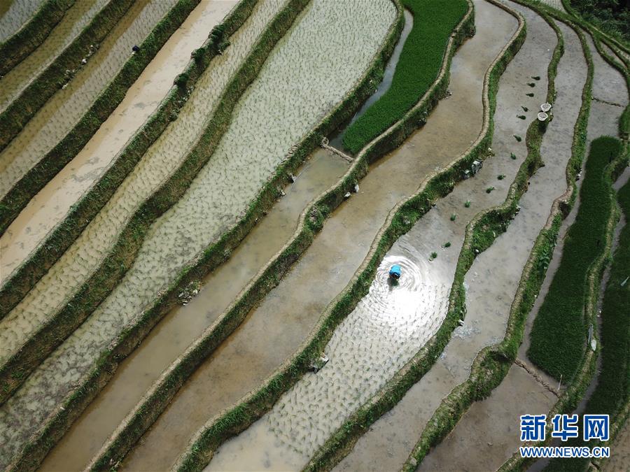 5月23日,在贵州省黔东南苗族侗族自治州从江县加鸠镇秀摆村,农民在梯田里劳作(无人机照片)。 新华社发(刘进银 摄)