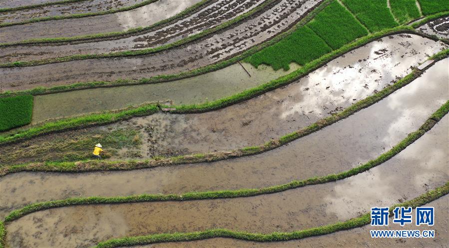 5月23日,在贵州省铜仁市玉屏侗族自治县亚鱼乡郭家湾村,农民在梯田里劳作(无人机照片)。 新华社发(胡攀学 摄)