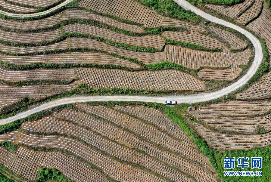 5月23日,在湖北省恩施土家族苗族自治州宣恩县珠山镇铁厂坡村,农民在旱作梯田里劳作(无人机照片)。 新华社发(宋文 摄)
