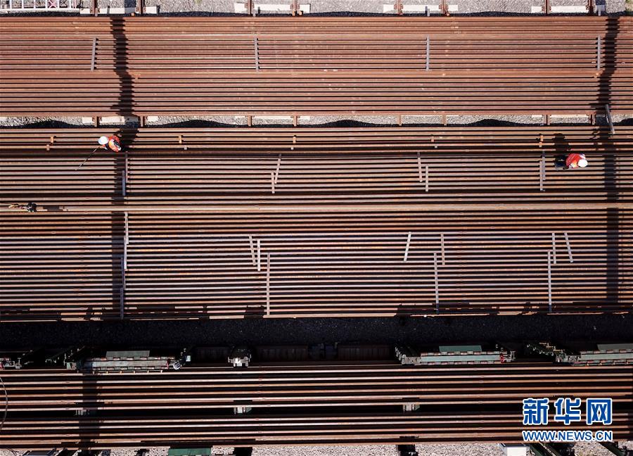 5月23日,在中铁十二局合安高铁长轨基地,工作人员进行卸轨作业(无人机照片)。新华社记者 刘军喜 摄