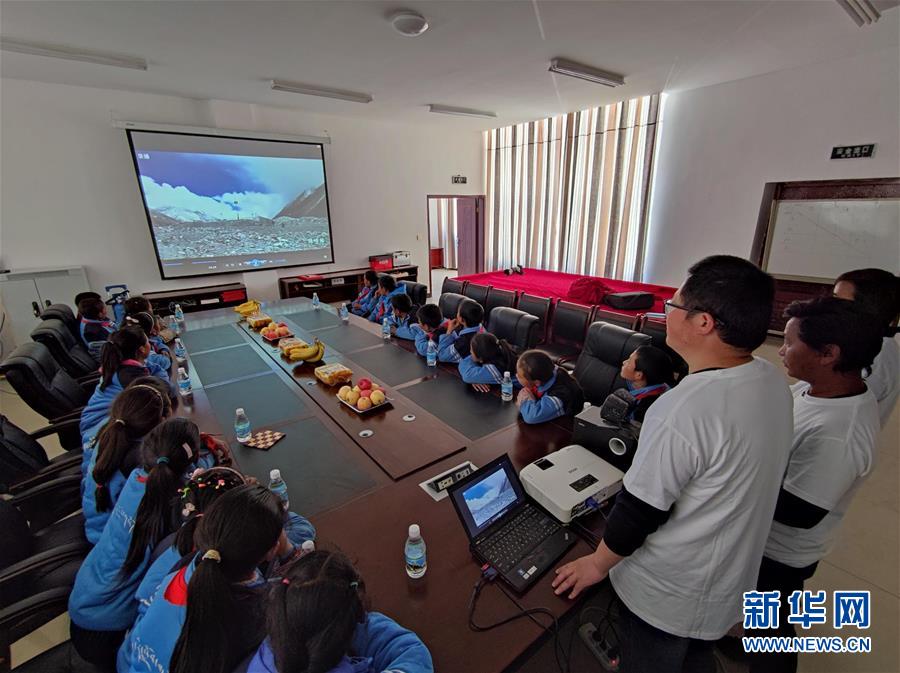 5月23日,珠峰站的工作人员为参加“公众科学日”活动的学生放映科学宣传片。 新华社记者 王沁鸥 摄