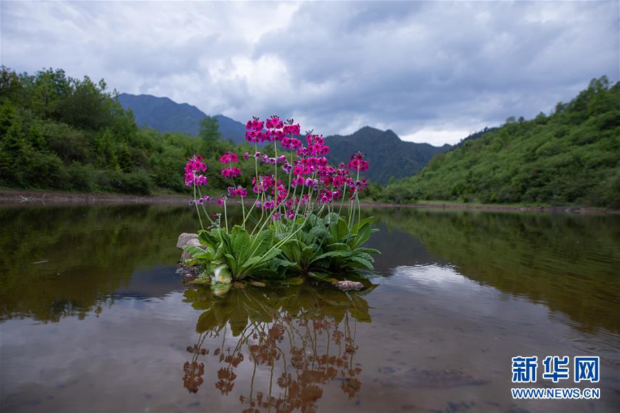 在四川省汉源县桌子山,几株报春花生长在水中(5月24日摄)。 新华社记者 江宏景 摄