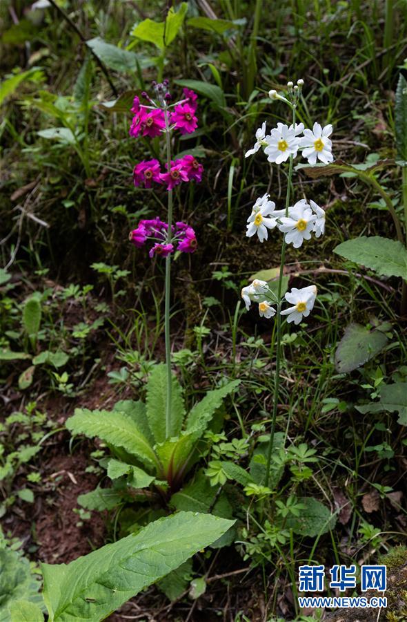 在四川省汉源县桌子山,一株红色的报春花旁生长着一株白色的报春花(5月24日摄)。 新华社记者 江宏景 摄