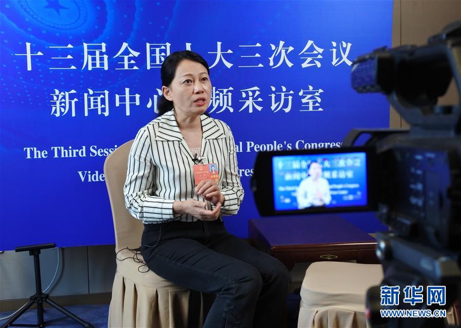 5月20日,全国人大代表方燕在十三届全国人大三次会议陕西代表团驻地的新闻中心视频采访室接受采访。 新华社记者 吴雨 摄