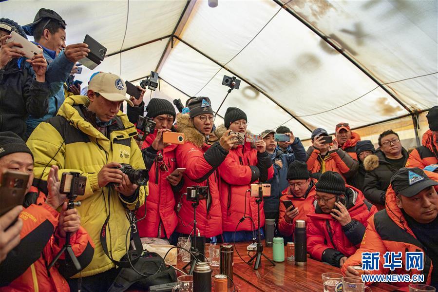 在位于海拔5200米珠峰大本营的指挥帐内拍摄的等待登顶消息的人们(5月27日摄)。 5月27日,2020珠峰高程测量登山队成功登顶世界第一高峰珠穆朗玛峰。他们在峰顶竖立觇标,安装GNSS天线,开展各项峰顶测量工作。45年前的今天,中国人首次将觇标带至珠峰峰顶。 新华社记者 孙非 摄