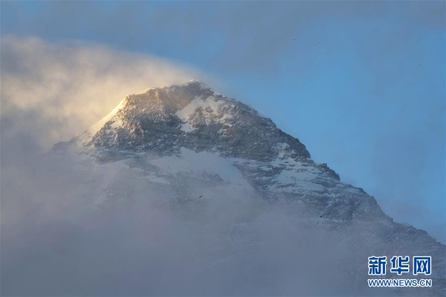日出时分,用超远摄镜头拍摄的珠穆朗玛峰(5月27日摄)。 5月27日,2020珠峰高程测量登山队成功登顶世界第一高峰珠穆朗玛峰。他们在峰顶竖立觇标,安装GNSS天线,开展各项峰顶测量工作。45年前的今天,中国人首次将觇标带至珠峰峰顶。 新华社记者 晋美多吉 摄