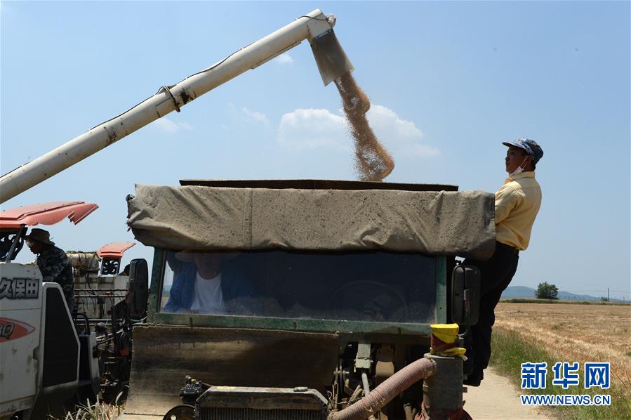 5月27日,在安徽省凤阳县红心镇七里村,农机手将收割的小麦装车。 近日,安徽省凤阳县小麦陆续开始收割,当地农民紧抓农时收获小麦,确保夏粮归仓。 新华社发(黄博涵摄)