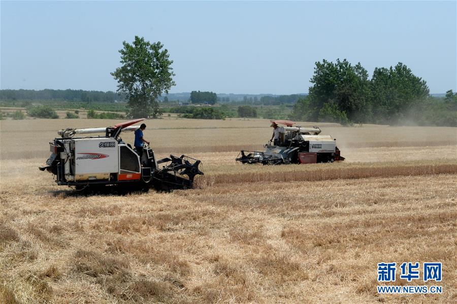 5月27日,在安徽省凤阳县红心镇七里村,农机手操作机械设备收割小麦。 近日,安徽省凤阳县小麦陆续开始收割,当地农民紧抓农时收获小麦,确保夏粮归仓。 新华社发(黄博涵摄)