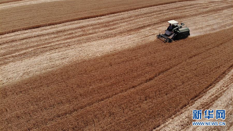 5月27日,在安徽省凤阳县红心镇七里村,农机手操作机械设备收割小麦(无人机照片)。 近日,安徽省凤阳县小麦陆续开始收割,当地农民紧抓农时收获小麦,确保夏粮归仓。 新华社发(黄博涵摄)