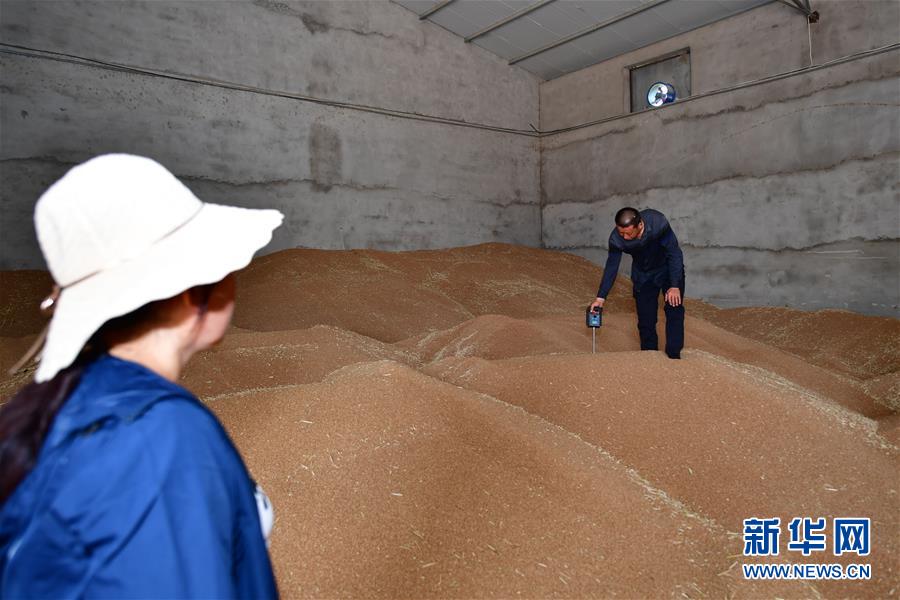 5月27日,在河南省南阳市宛城区汉冢乡万庄村,高新洋和妻子刁静莹在检查仓库中小麦含水率。新华社记者 冯大鹏 摄