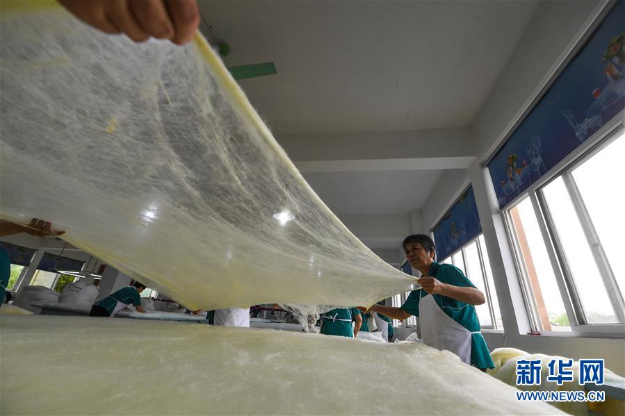5月27日,在位于桐乡市洲泉镇的浙江蚕缘家纺股份有限公司内,工作人员把加工好的黄金蚕丝进行“拉丝绵”工序,准备用于制作蚕丝被。 近期,蚕桑之乡浙江省桐乡市的蚕农们迎来了蚕茧丰收的季节,其中新品种“黄金茧”的增收效果尤其明显。据介绍,与普通蚕丝相比,色泽金黄的黄金蚕丝中叶黄素含量高,抗菌效果更好,深受市场青睐。2020年春季,浙江省桐乡市共计发放黄金蚕茧种1225张,产量预计75吨,总产值近300万元,较普通蚕茧增收约20%,成为当地农业增收的亮点。 浙江省桐乡市是我国蚕桑的重要产地,“桐乡蚕桑习俗”也被国务院列入第二批国家级非物质文化遗产名录。 新华社记者 徐昱 摄
