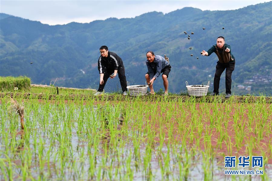 5月26日,贵州省黔东南州住建局派驻从江县加榜乡加车村的帮扶干部(左一、右一)帮助村民一起播撒种螺。