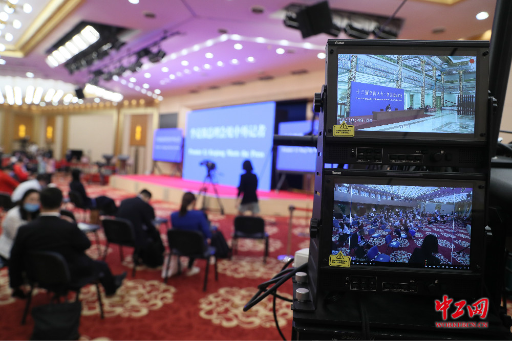据了解,今年总理答记者问将首次使用小程序进行直播,在“国务院客户端”小程序上即可预约。图为梅地亚中心分会场的记者正在进行会前采访和准备工作。中工网记者 王伟伟 摄