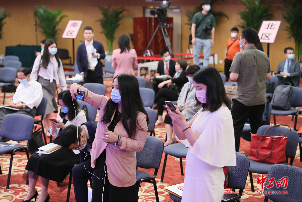 据了解,今年总理答记者问将首次使用小程序进行直播,在“国务院客户端”小程序上即可预约。图为梅地亚中心分会场的记者正在进行会前采访和准备工作。中工网记者 王伟伟 摄