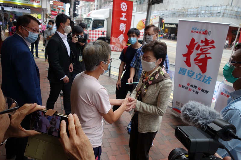 林郑月娥还慰问了现场义工,并与他们合照。林郑月娥说:“大家辛苦,支持国安立法!加油!”在场工作人员都很激动,士气高昂。27日,香港特区政府政务司司长张建宗、保安局局长李家超等司局级官员也赴市区站点签名,支持相关活动。目前,在“香港各界撑国安立法联合阵线”的网站,已经有超过920428人参加签名。(总台记者 周伟琪 叶丽丽)