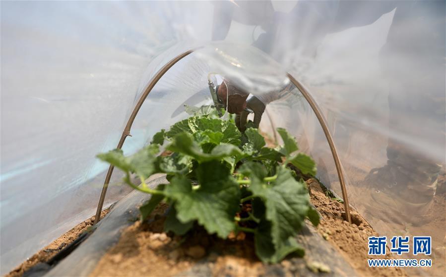 5月28日,一位瓜农在为地膜里的香瓜苗喷营养液。新华社记者 姚剑锋 摄