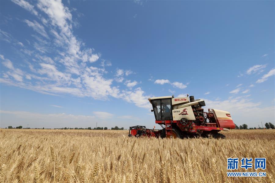 5月29日,河南省焦作市温县赵堡镇北平皋村农民驾驶农机在田间收获小麦。 新华社发(徐宏星 摄)
