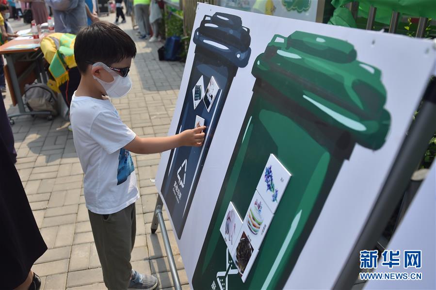 5月30日,小朋友将垃圾卡片贴在对应的垃圾板上。 当日,北京市东城区体育馆路街道举办垃圾分类亲子嘉年华活动。活动包含“精细化保洁车巡展”“可回收物我来投”“诵读垃圾分类歌谣”等项目,以轻松趣味的形式宣传垃圾分类知识和方法。 新华社记者 彭子洋 摄
