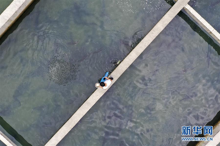 5月27日,在大河乡红光村金丰泰养殖专业合作社,一名在合作社务工的当地村民在给鲟鱼投放鱼食(无人机照片)。 大河乡红光村位于重庆巫溪县的大山深处,近年来,红光村因地制宜充分依靠优质水资源,成立金丰泰养殖专业合作社,共计投入150万元修建标准化鱼塘32个。金丰泰养殖专业合作社运用“村集体+合作社+农户模式”,发展以鲟鱼为主的特种鱼类养殖项目,壮大村集体经济,带动农户增收致富。 新华社记者 刘潺 摄