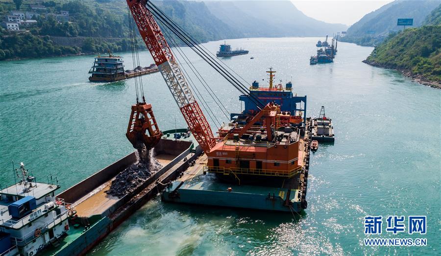 5月30日,施工船舶在三峡大坝下游莲沱水域清除航道内阻碍航行的礁石(无人机照片)。 近日,位于长江三峡大坝至葛洲坝之间的湖北省宜昌市夷陵区乐天溪镇莲沱段航道整治工程项目实现全面复工复产,施工船舶全部进场,现场施工有序推进。工程竣工后,三峡“两坝”间的水域将更加通畅安全。 新华社发(郑家裕 摄)