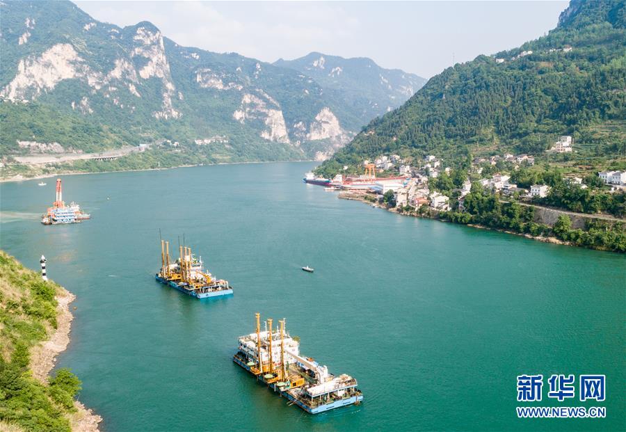 5月30日,施工船舶在三峡大坝下游莲沱水域清除航道内阻碍航行的礁石(无人机照片)。 近日,位于长江三峡大坝至葛洲坝之间的湖北省宜昌市夷陵区乐天溪镇莲沱段航道整治工程项目实现全面复工复产,施工船舶全部进场,现场施工有序推进。工程竣工后,三峡“两坝”间的水域将更加通畅安全。 新华社发(郑家裕 摄)