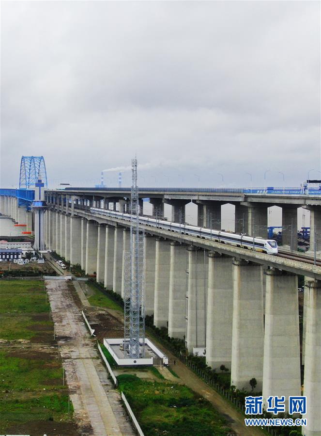 5月30日,一列试运行列车组驶入沪通长江大桥(无人机照片)。 当日,通沪铁路赵甸至黄渡段进入运行试验阶段,预计于6月底具备开通运营条件。 新华社发(赵亿政 摄)