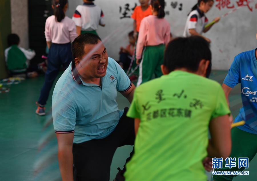 七星小学跳绳队教练赖宣治(左)正大吼着激励队员训练。正是这位没有接触过专业跳绳训练的的体育老师把跳绳运动引入学校,十年不懈,领着孩子们从乡村的小操场跳到世界的大舞台(2019年11月18日摄)。 新华社记者刘大伟摄