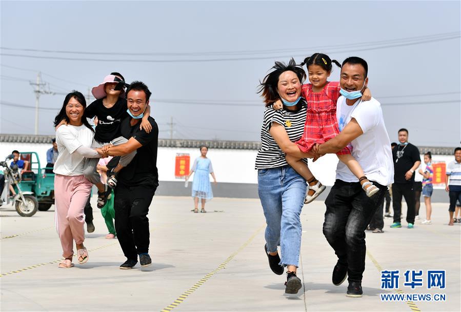 5月31日,在河南省夏邑县太平镇刘花园村,小朋友和家长在村里组织的趣味运动中参加“抬轿子”比赛。 “六一”国际儿童节临近,各地举行丰富多彩的活动,让孩子们在欢乐中迎接自己的节日。 新华社发(苗育才 摄)
