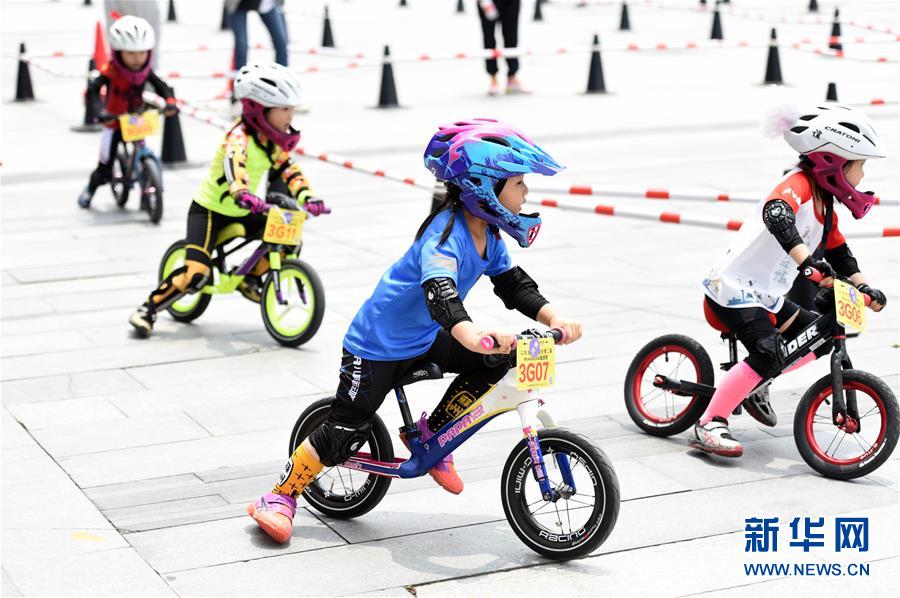 5月31日,小朋友在江苏省淮安市举办的儿童滑步车骑行比赛中。 新华社发(贺敬华 摄)