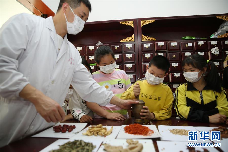 5月31日,小朋友在贵州省黔南布依族苗族自治州福泉市中医医院中药房体验捣药。 新华社发(黄欢 摄)