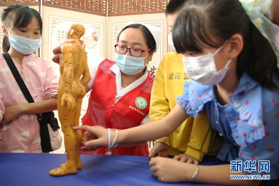 5月31日,在贵州省黔南布依族苗族自治州福泉市中医医院,医务人员向小朋友介绍人体穴位知识。 新华社发(黄欢 摄)