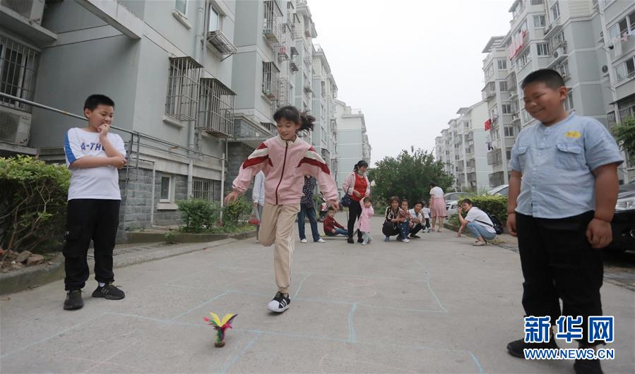 5月31日,在江苏省扬州市广陵区汤汪乡杉湾花园社区,小朋友参加社区举办的趣味游戏活动。 “六一”国际儿童节临近,各地举行丰富多彩的活动,让孩子们在欢乐中迎接自己的节日。 新华社发(孟德龙 摄)