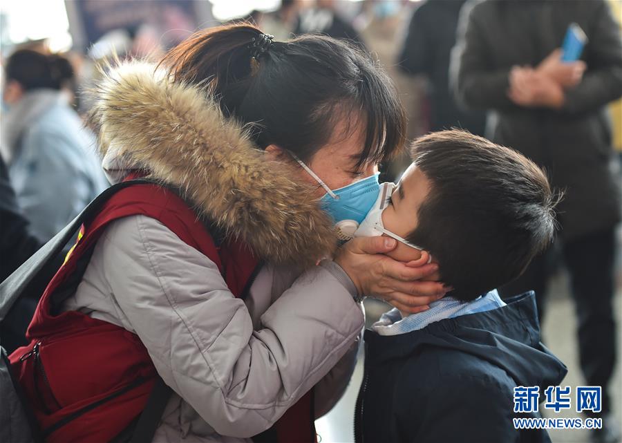 山西太原武宿国际机场,儿子与援鄂医疗队的妈妈告别(2月20日摄)。 新华社发(柴婷摄)