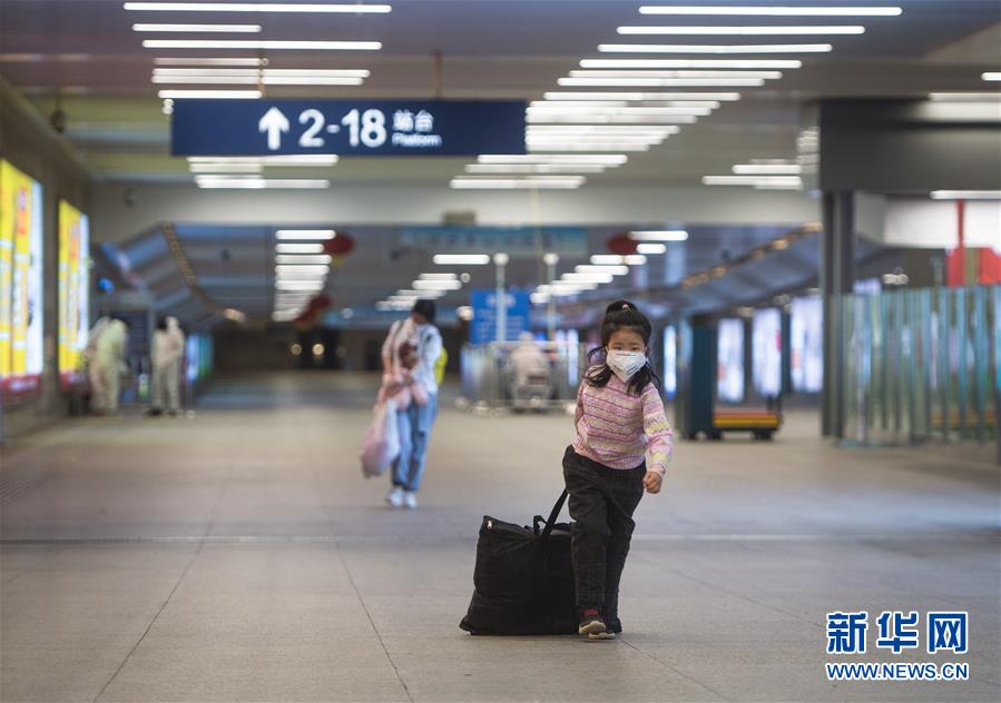 武汉恢复铁路客站到达业务当天,在武汉汉口火车站,一名小女孩拉着行李走在家长的前面(3月28日摄)。 新华社记者 肖艺九 摄