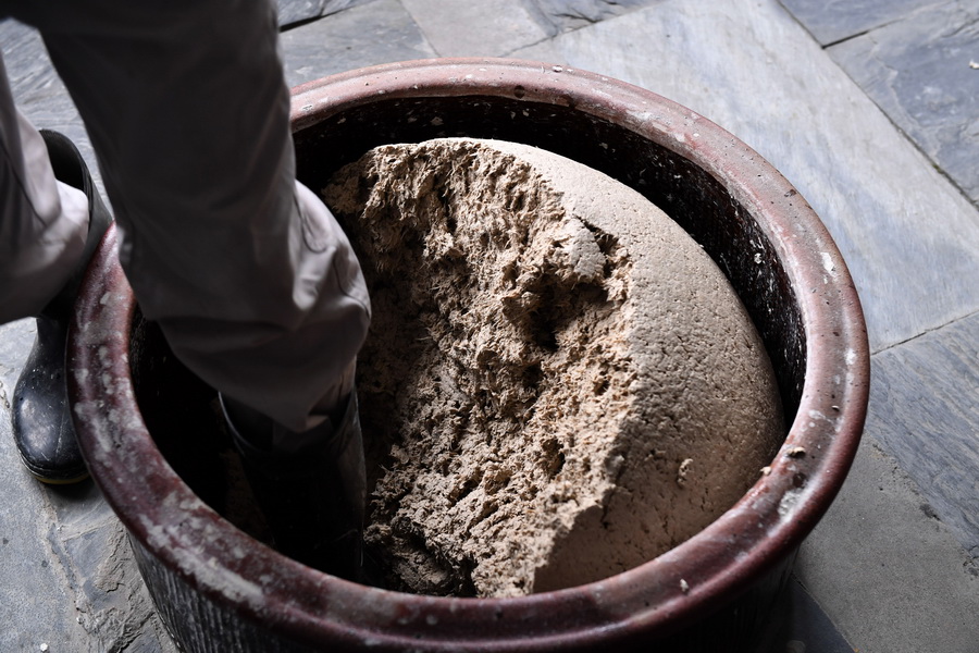 宣纸厂工人在进行踏料作业。张大岗 摄