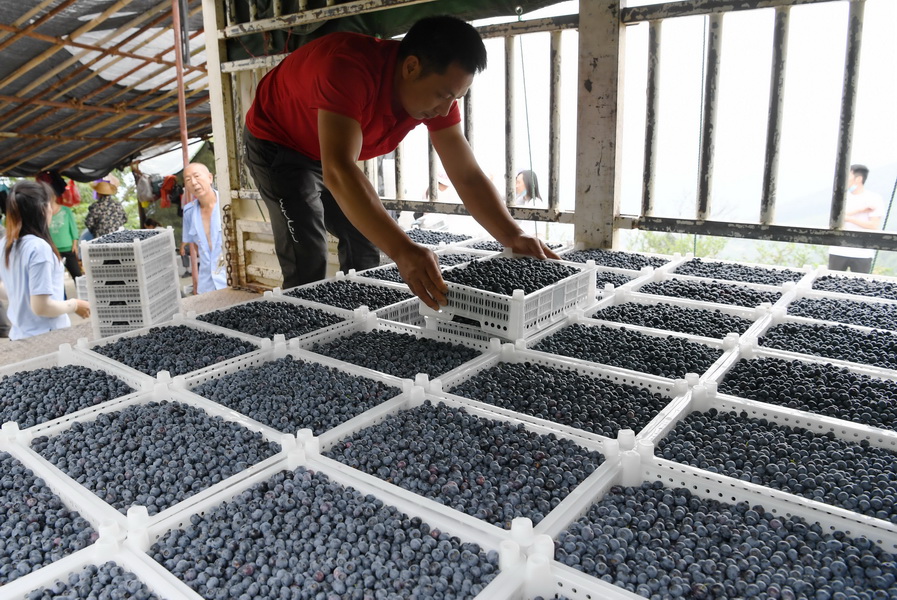 5月31日,游客在湖北省襄阳市保康县过渡湾镇茶庵村蓝莓种植基地采摘蓝莓。