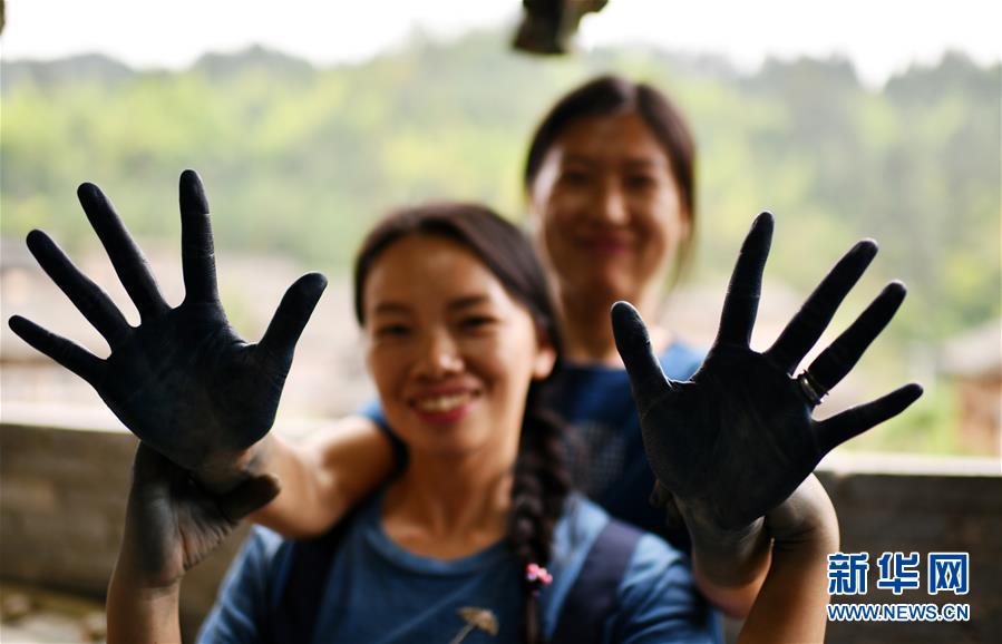 杨成兰(前)与一名学徒在展示被植物染料染黑的双手(5月28日摄)。