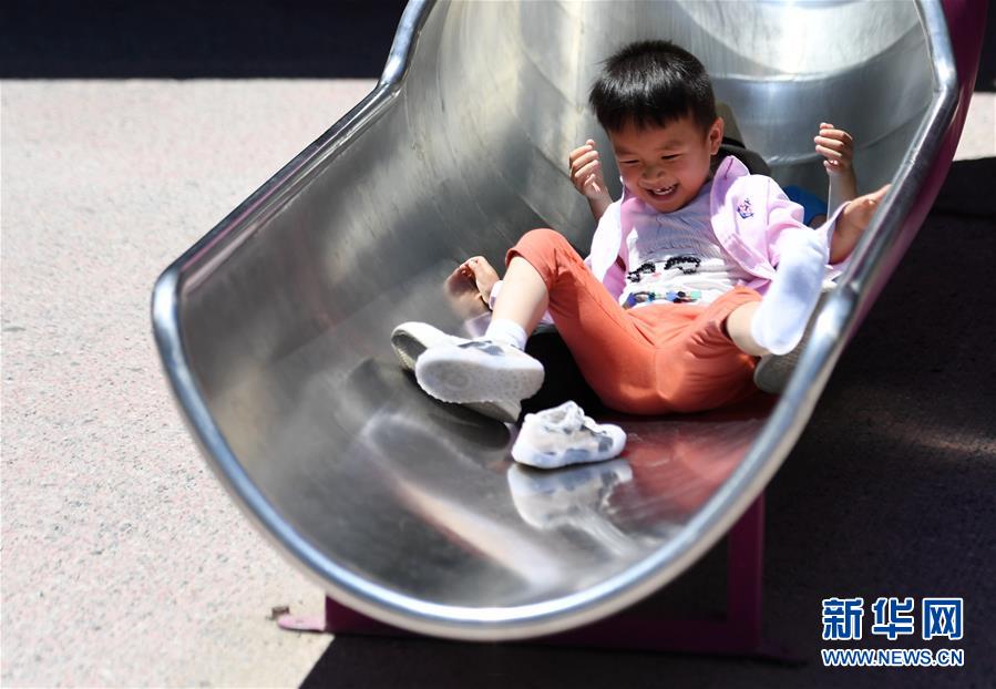 5月31日,小朋友在北京五棵松华熙Live滑滑梯。新华社记者 张晨霖 摄