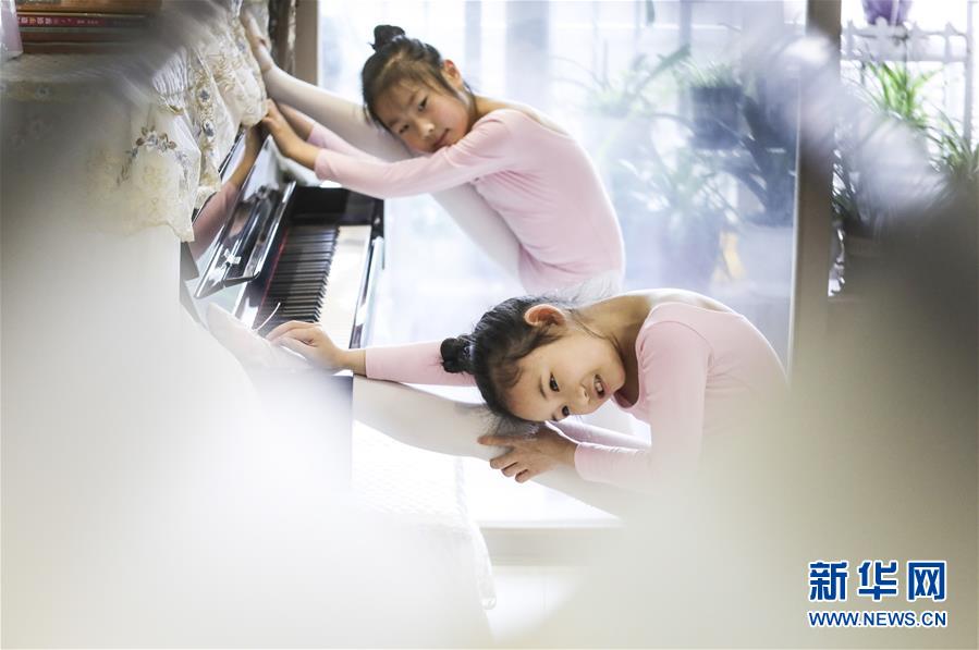 图为5月31日,朱皓嫡(前)与陈熙妍在进行拉伸,准备练舞。 新华社记者欧东衢摄