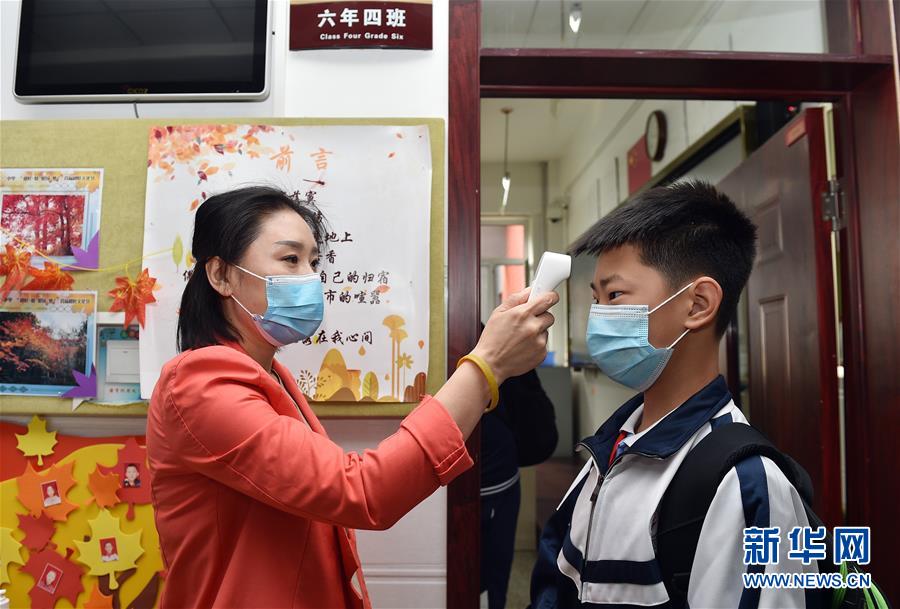 6月1日,在长春市第103中学小学部,六年级学生进入教室前接受体温检测。 当日是“六一”国际儿童节,吉林长春市初一、初二年级和小学五、六年级正式开学复课,涉及学生12.7万人。 新华社记者 林宏 摄